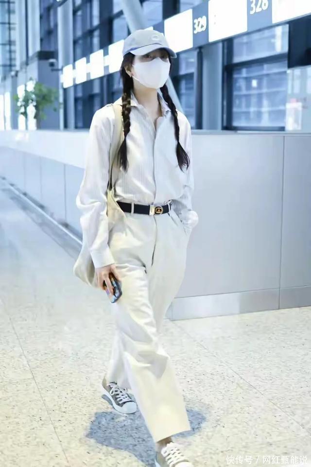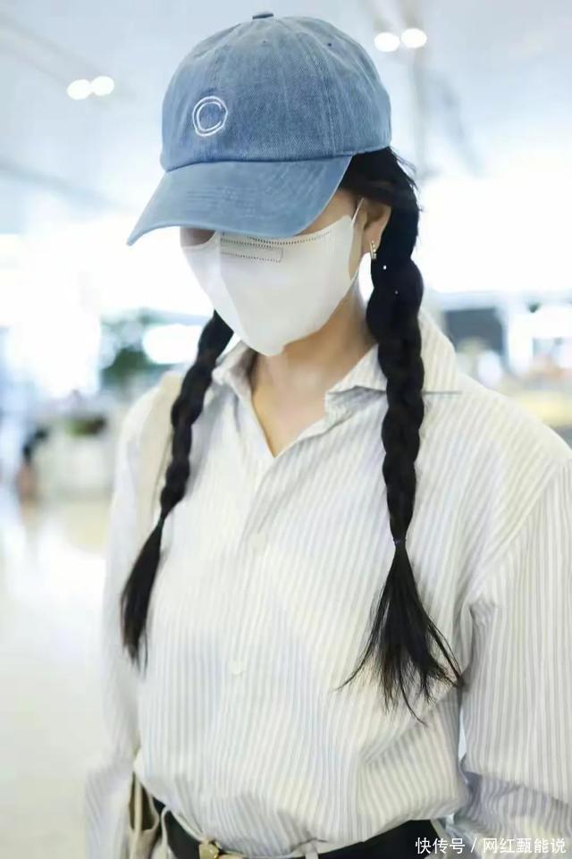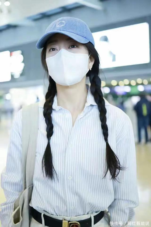 殷桃双麻花辫配条纹衬衫,这套机场Look太显年轻了